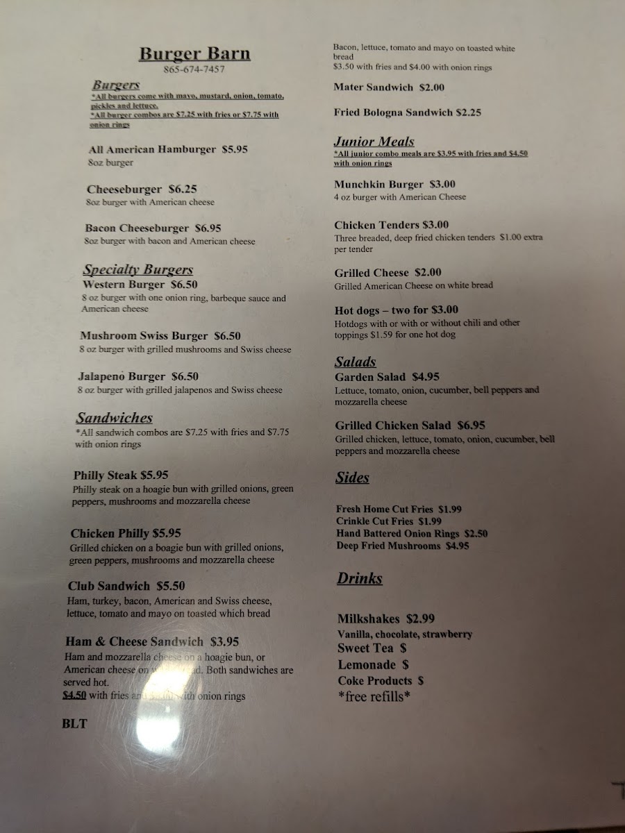 Welcome to Burger Barn, a gem nestled in White Pine, TN. This hamburger restaurant is a must-visit for anyone craving delicious bites. The menu offers a delectable array of options, including handcrafted burgers like the mouthwatering All American Burger, along with sandwiches such as the Philly Steak and the classic Club Sandwich.